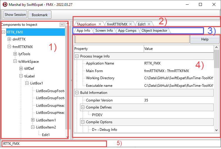 Marshal displays a left hand tree of forms and datamodules to allow you to navigate your applications components to inspect at runtime. The first page is the the app info inspector which captures some runtime values from your application.