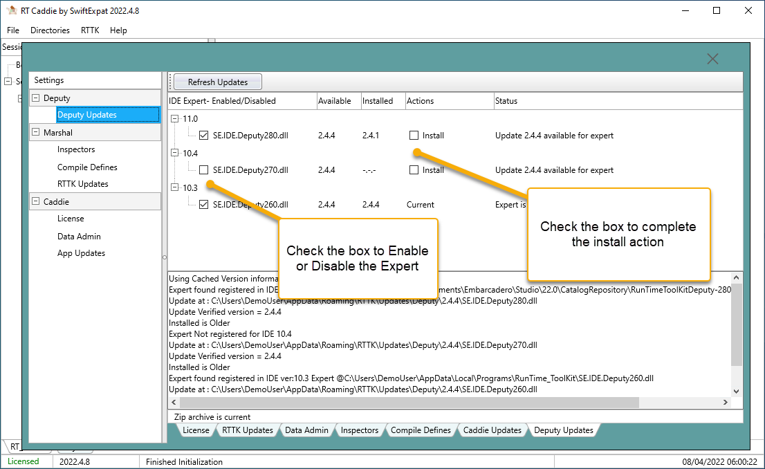 The licensed version of Deputy is installed from Caddie version 4.8.2022 and later. Access the install via File –> Settings –> Deputy Updates.